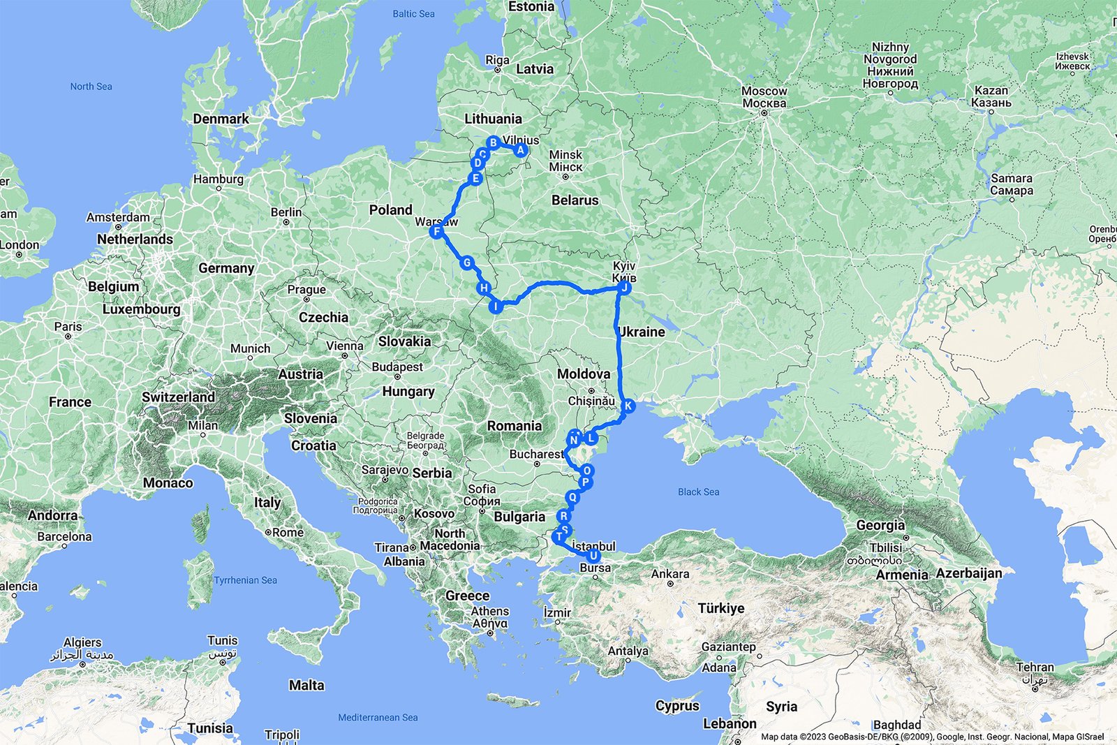 Vilnius – Warsaw – Lviv – Kiev – Odesa – Izmail – Braila – Constansa – Varna – Burgas – Istanbul
